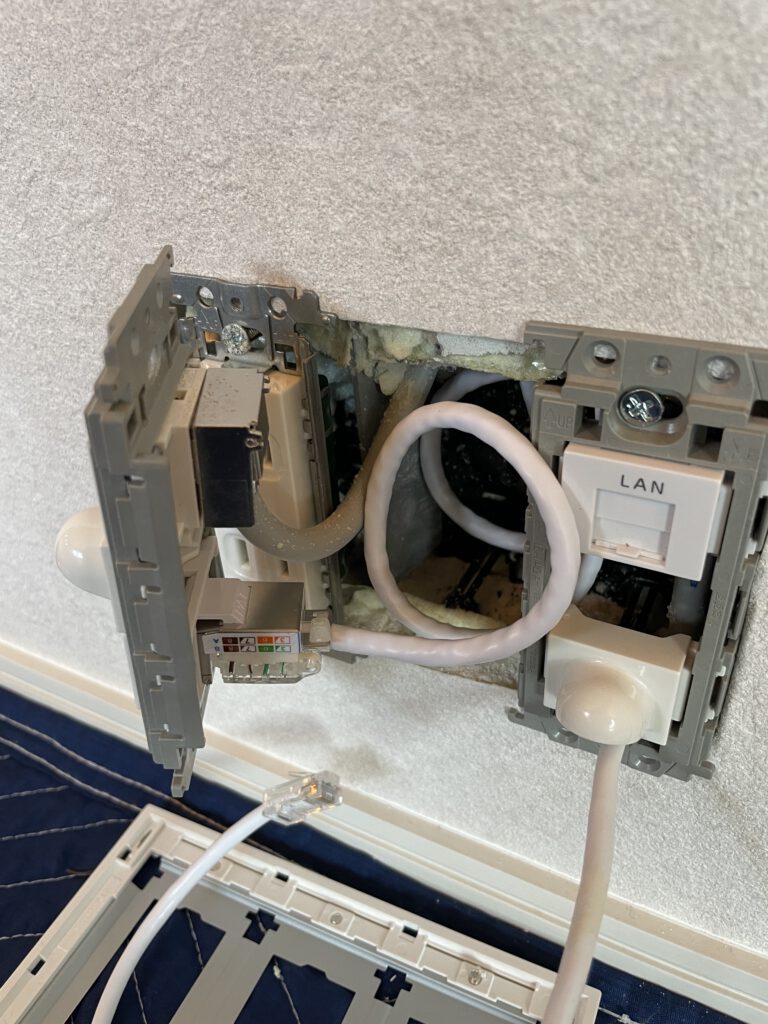 1階から2階までLANケーブルを配線し、2階でも安定した有線LANがご利用いただけるように施工いたしました。 あわせて、新しいLAN差込口(モジュラージャック)も設置し、より快適なネット環境をご提供し…